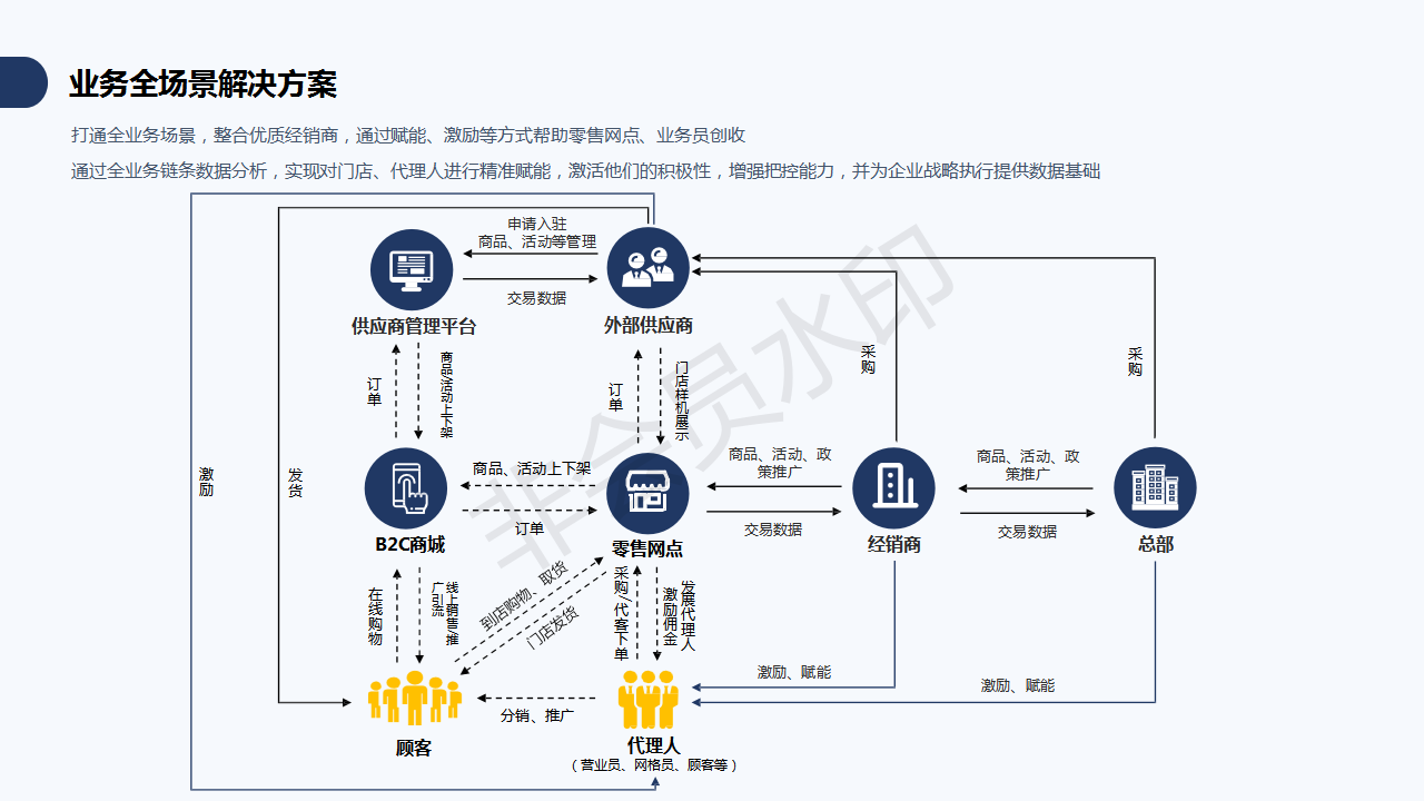 四是數(shù)據(jù)分析,供貨商、經(jīng)銷商、消費者的交易數(shù)據(jù)都在平臺留存,可以通過數(shù)據(jù)分析挖掘其中的價值。